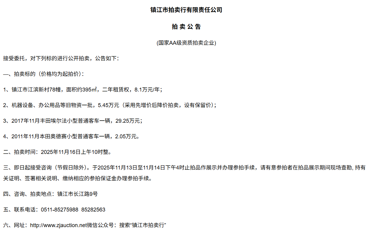 本公司受鎮(zhèn)江市公安局委托,對2025年度鎮(zhèn)江市市區(qū)摩托車上牌額度認(rèn)購權(quán)進(jìn)行拍賣,現(xiàn)將有關(guān)事項(xiàng)公告如下: